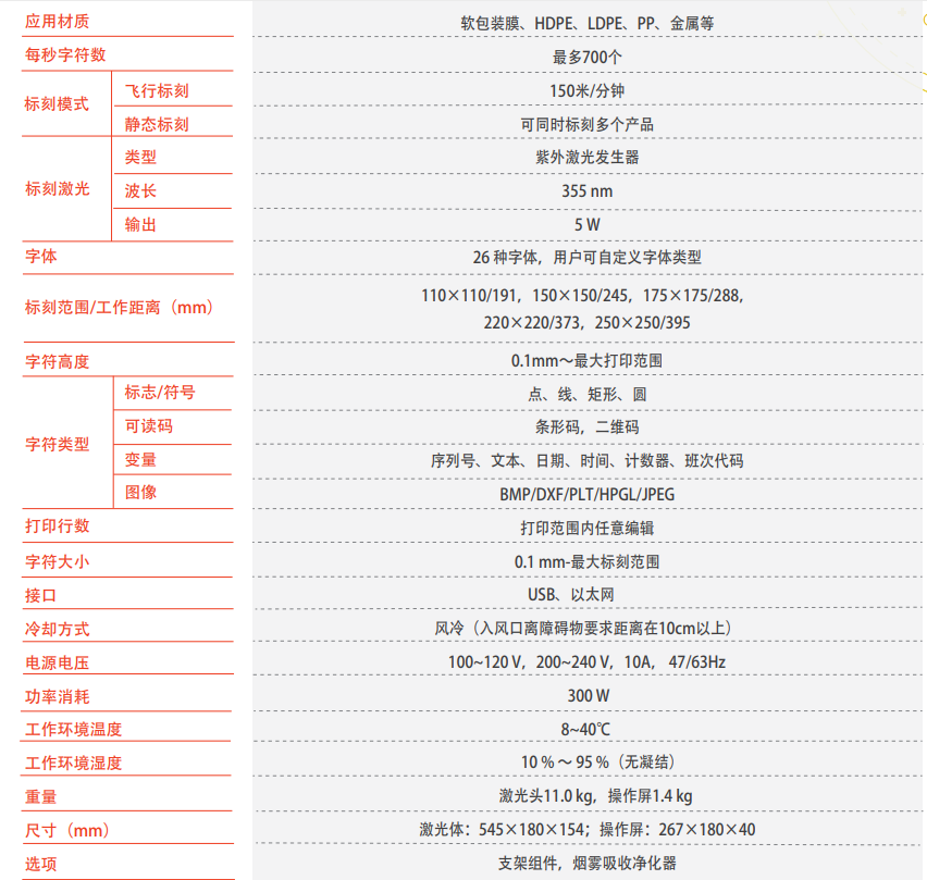 独特的激光控制技术和风冷技术,可在薄膜、硬塑料、金属等材质上轻易标识出清晰的打印效果。机器体积小巧,低维护,无耗材,无需冷水机,提供高质量打码。在各式包装机上得到广泛应用,永久性及高对比度的标识,确保产品的可追溯性,是防伪防窜系统的首选产品。