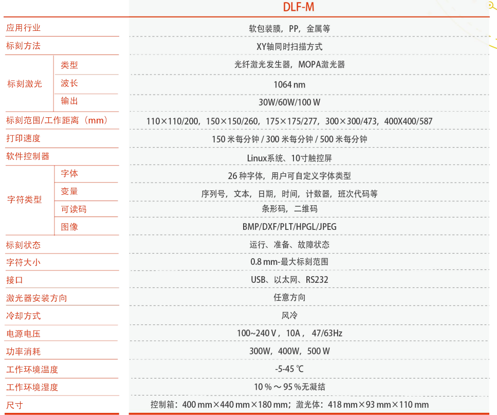 采用智能矢量控制算法,标刻速度大幅提升。体积小巧,低维护,无耗材,可提供高质量打码。拥有优化的标刻字体库,可在食品、化妆品等行业常用的柔性包装、硬塑料(PE/PP)、金属和其他材料上打印永久性及高对比度的标识,确保产品可追溯性,同时在非金属打码时,将获得比CO2激光打码机更加清洁的标识。